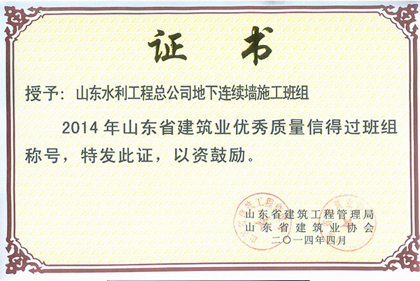 公司“地下連續(xù)墻施工班組”榮獲2014年山東省建筑業(yè)優(yōu)秀質(zhì)量信得過班組稱號