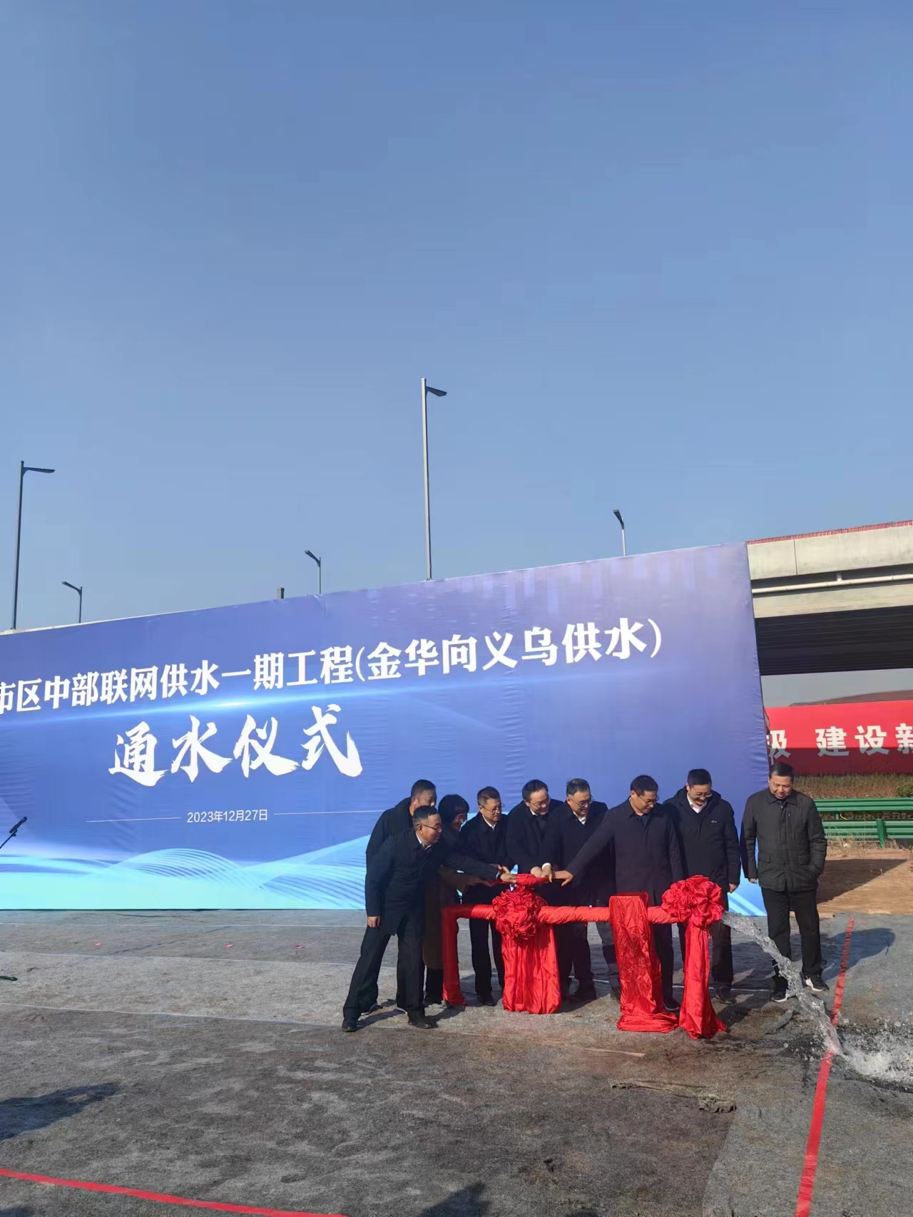 12月27日上午,在金義都市區(qū)中部聯(lián)網(wǎng)一期工程中央大道與華東街交叉處,隨著一股清泉從供水管道口噴涌而出,由第六分公司承建的金華—義烏供水工程實現(xiàn)正式通水。金華市政府、金華市城投集團等相關(guān)單位共同見證了該通水儀式。