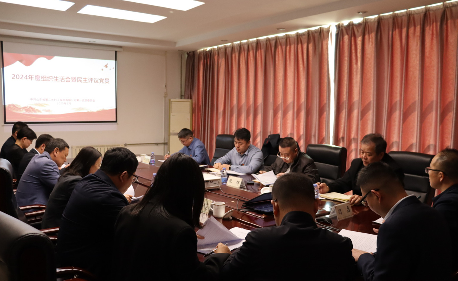 3月18日,二局有限公司第一黨支部召開2024年度組織生活會暨民主評議黨員會議。公司黨委書記、董事長裴文晶,綜合辦公室(黨委辦公室)主任張輝到會指導。黨支部書記王鵬主持會議。